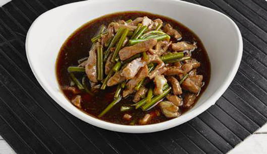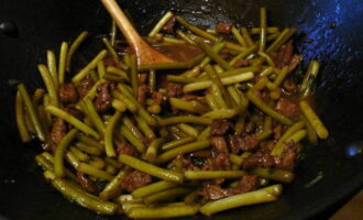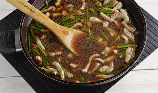 Giet daarna de bereide saus erbij en breng aan de kook. Zet vervolgens het vuur lager en laat 5 minuten op laag vuur sudderen. Hierdoor krijg je malse scheuten knoflook met stukjes vlees in een hete-zoete saus.