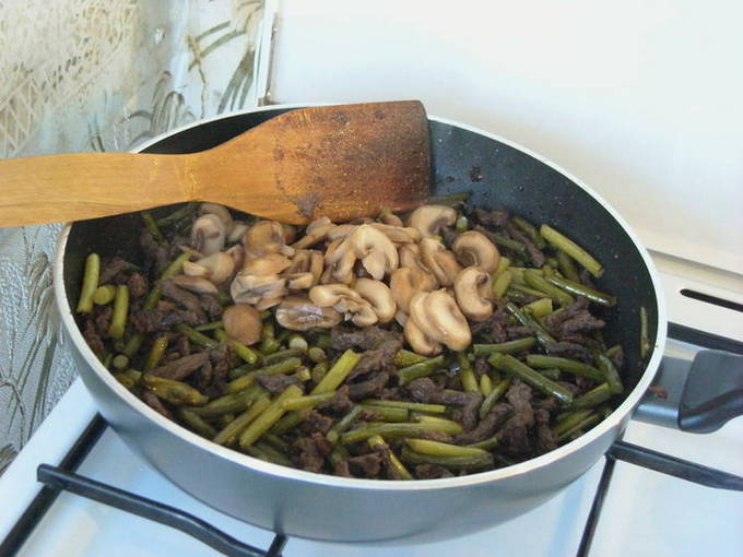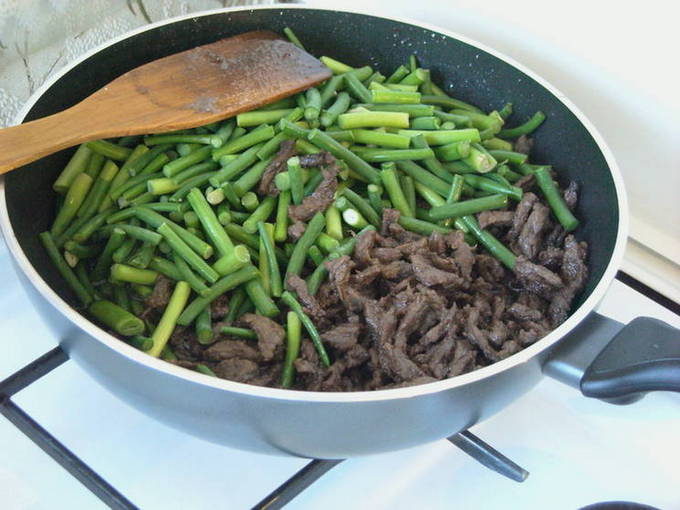 - Was de knoflookpijlen, hak ze fijn en voeg ze toe aan het vlees, bak ze 10-15 minuten onder voortdurend roeren.