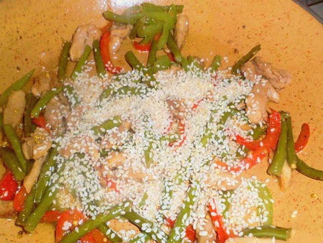 - Rooster de sesamzaadjes een beetje en zet het vuur uit. Een heerlijk gerecht van knoflookpijltjes en kip staat klaar.