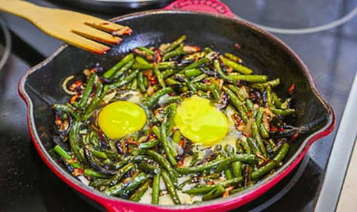 - Serveer hete gefrituurde knoflookscheuten met eieren en tomaten.