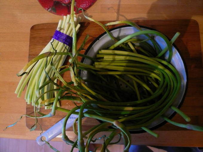 - Was de knoflookpijlen, snij de zaaddozen af en snij de scheuten in reepjes.