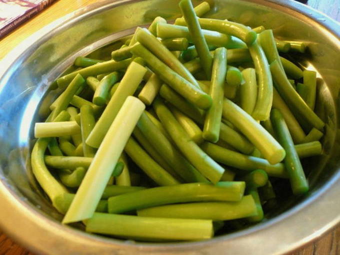 - Was de knoflookpijlen en snijd ze in reepjes van 3-4 centimeter lang.