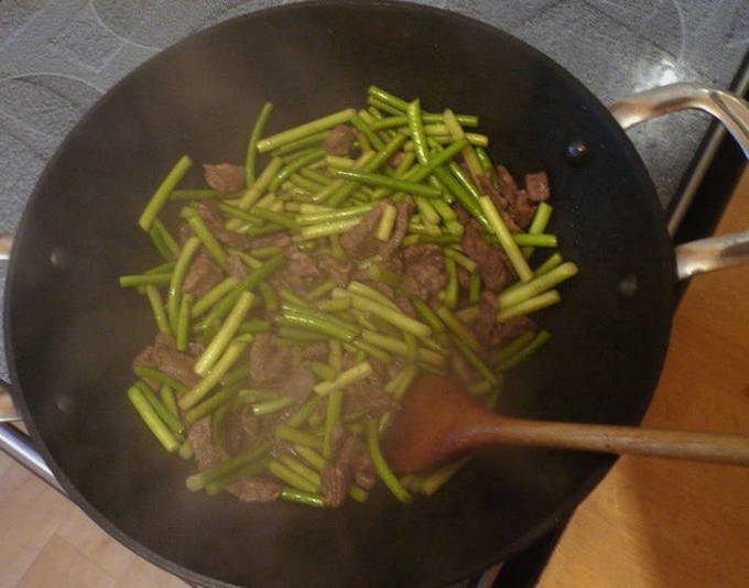 Giet plantaardige olie in de pan. Snijd het vlees in dunne reepjes en bak 2-3 minuten op hoog vuur. Voeg dan de knoflookpijlen toe en bak nog 3 minuten.