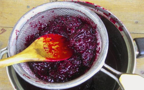 - Vervolgens moet je vers geperst sap uit de bessen halen. Hiervoor gebruiken we een zeef of speciale techniek. Vervolgens filteren we de massa door kaasdoek.