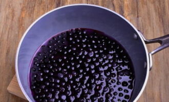 Zeef de bessenmassa door een zeef en laat afkoelen tot 70 graden. Voeg de gezwollen gelatine toe aan de bosbessensiroop, mix tot een gladde massa.
