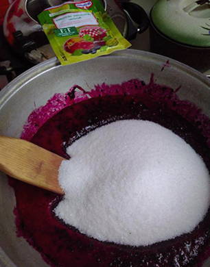 - We dompelen het bessenmengsel in een pan. We vullen het met de benodigde hoeveelheid suiker en voegen meteen de pectine toe. Breng het product aan de kook en kook het vervolgens nog een minuut. Roer zodat de gelei niet verbrandt.