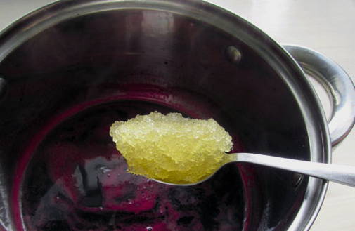 - Voeg vervolgens de gelatineuze massa toe aan het warme bosbessensap, roer tot een gladde massa.