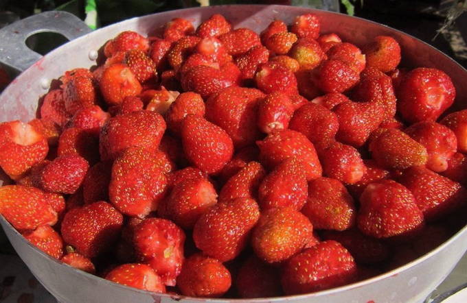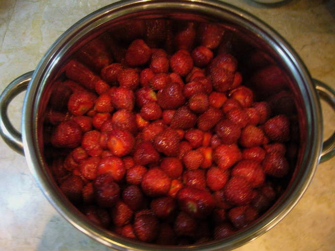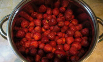 - We sorteren de aardbeien, wassen en verwijderen de stelen. We doen de voorbereide bessen in een pan.
