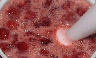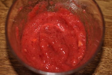 Doe de aardbeienjam in een blender en pureer of gebruik een staafmixer. Dit duurt ongeveer 3-5 minuten. Doe daarna de puree terug in de pan en verwarm nog 5-7 minuten.