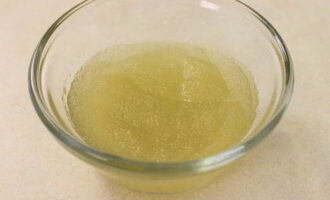 Terwijl de aardbeienmassa kookt, giet je de gelatine met heet water en laat je het al roerend oplossen, dit duurt 5-7 minuten.