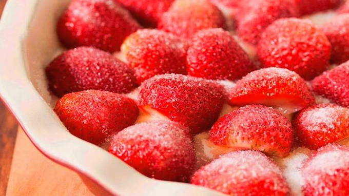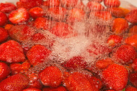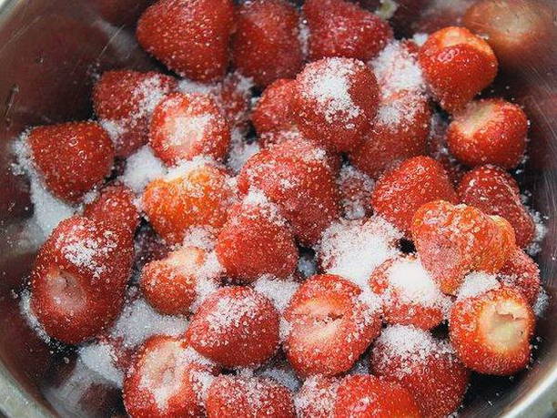 - Spoel de aardbeien af zodat er geen zand op de bessen achterblijft en giet de resterende suiker in een apart bakje zodat de bessen het sap laten stromen.