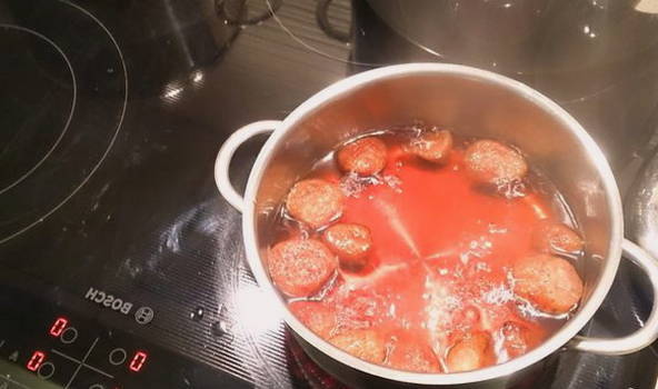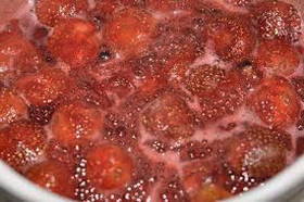 - Giet aardbeien met bessengelei en kook samen ongeveer 5 minuten.