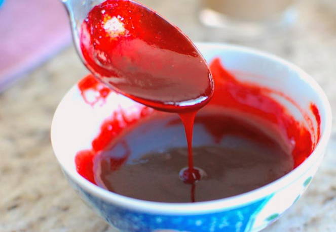 - Brouw suikersiroop van een eetlepel suiker en water, voeg daar de benodigde hoeveelheid citroenzuur toe en giet de siroop in een bak met aardbeiengelei. Goed roeren.