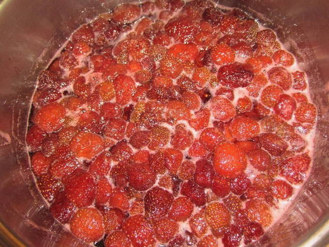 - Giet na 5 uur het sap van de aardbeien af, zet de bessen op middelhoog vuur en breng aan de kook, onder voortdurend roeren.