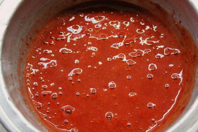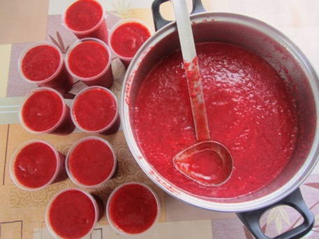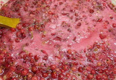 - Sorteer de rode bessen, verwijder de steeltjes en de groene bessen, spoel af, maal door een zeef, voeg 1/3 suiker toe aan de puree en laat enkele minuten koken.
