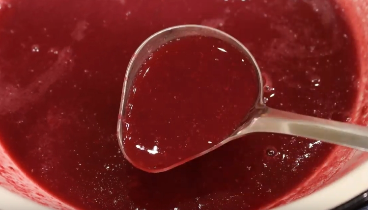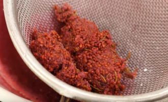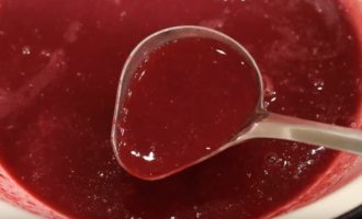 Maal de hete bessenmassa met een lepel op een zeef met kleine gaatjes zodat de zaden en de schil niet in de gelei komen. Als resultaat van deze actie krijg je een prachtige robijnkleurige bessenpuree.