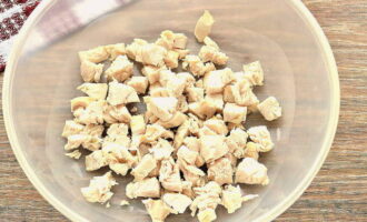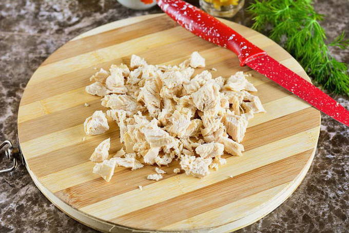 - Kook het kippenvlees, het water moet licht gezouten zijn. Daarna moet de filet worden afgekoeld en in stukjes worden gesneden.