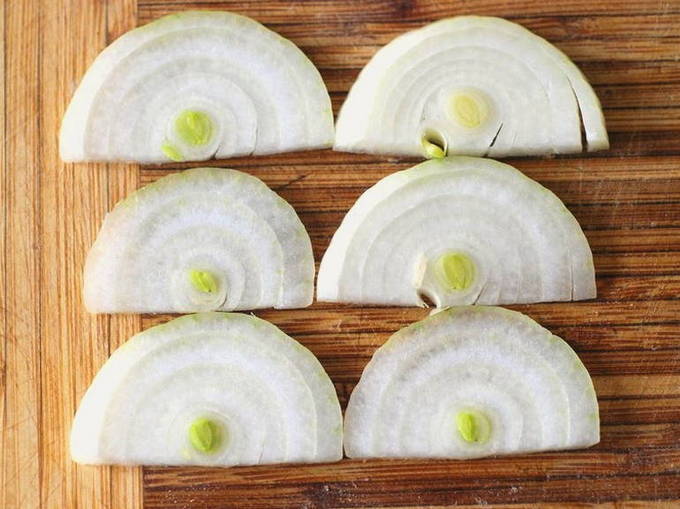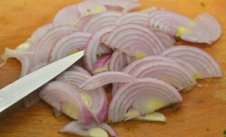 - De uien moeten in dunne halve ringen worden gesneden en in een pan worden gedaan. Bewaar ze op het fornuis totdat ze transparant worden.