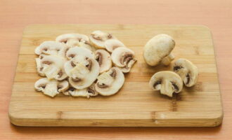 - Snijd kleine champignons in dunne plakjes. Als de champignons groot zijn, is het beter om ze in blokjes te hakken. Bak het bereide product goudbruin.