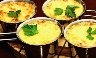 De resulterende massa wordt in cocotte-makers gelegd en bovenop is elke portie bedekt met geraspte kaas. Julien wordt in de oven geplaatst, waar het 20 minuten moet zweten op 180 graden. Het gerecht wordt direct warm geserveerd in geportioneerde blikken. Genieten van!