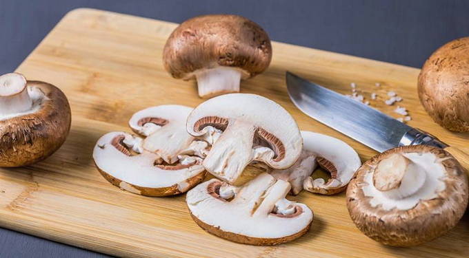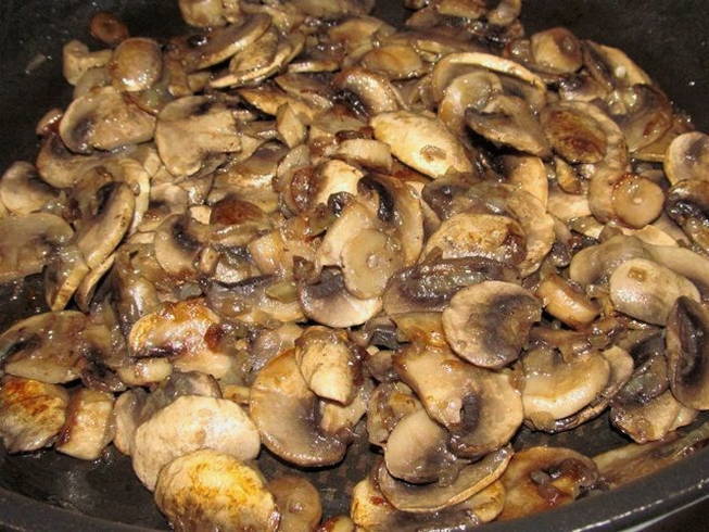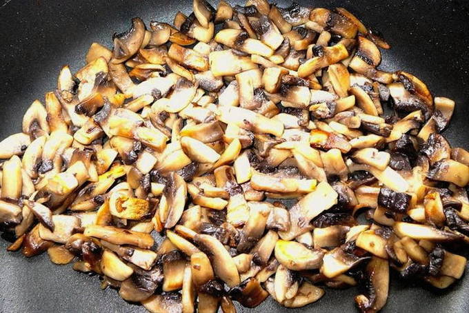 De schil wordt van de champignons verwijderd en de champignons worden in dunne plakjes gesneden. Daarna worden ze geplaatst met gebakken uien en knoflook. Alles bij elkaar moet je zout en zwarte peper toevoegen met droge peterselie. Het is beter als de peper versgemalen is: hierdoor wordt het gerecht aromatischer. Bak alles samen ongeveer 7 minuten.
