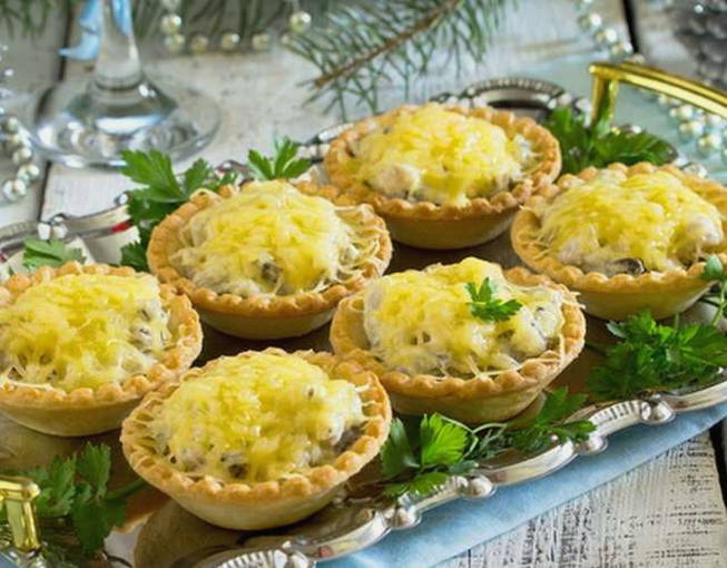 - Doe de vulling van champignons en vlees in de taartjes, leg de saus erop. Bestrooi elke portie met kaas en bak ongeveer 15 minuten, draai de oven 180 graden. Het is belangrijk dat de kaas niet alleen smelt, maar ook een stevige korst krijgt. Je kunt julienne warm serveren met een groentesalade.