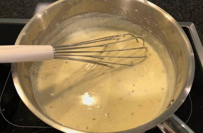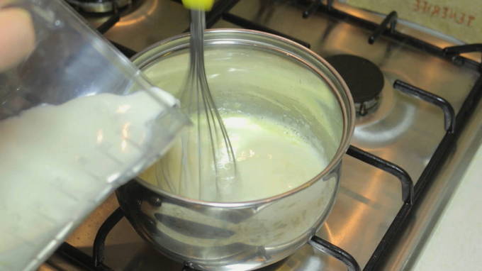 - Bak apart de aangegeven hoeveelheid bloem in boter tot het een romige tint krijgt en giet dan geleidelijk melk in de massa, af en toe roerend, om een saus a la bechamel te vormen.Laat de saus afkoelen en roer de zure room erdoor.