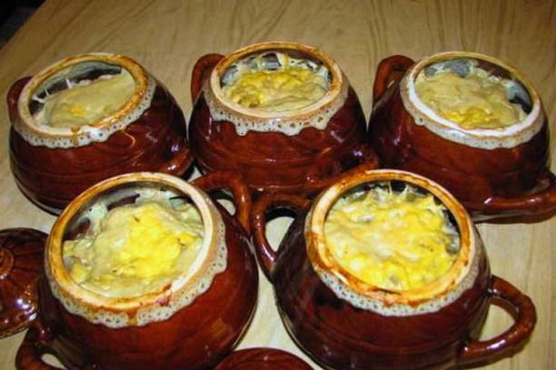 - Heerlijke julienne met kip en champignons met room in potten