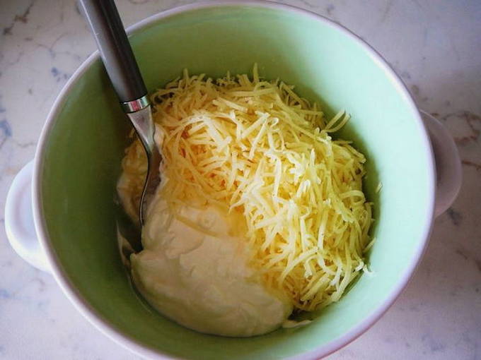 - Rasp harde kaas, meng de helft van het product met zure room.