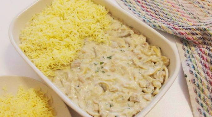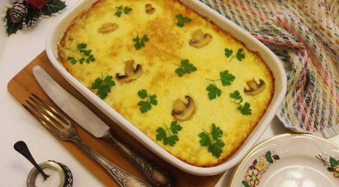 - Vlees en champignons worden in een hoge ovenschaal gelegd, met saus gegoten en bestrooid met kaas, geraspt op een grove rasp. De kaaslaag moet dik genoeg zijn om een krokant korstje te krijgen.
