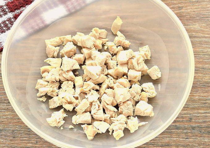 Kook kippenvlees door het in kokend gezouten water te leggen. Als de filet klaar is, moet deze in kleine blokjes worden gesneden.