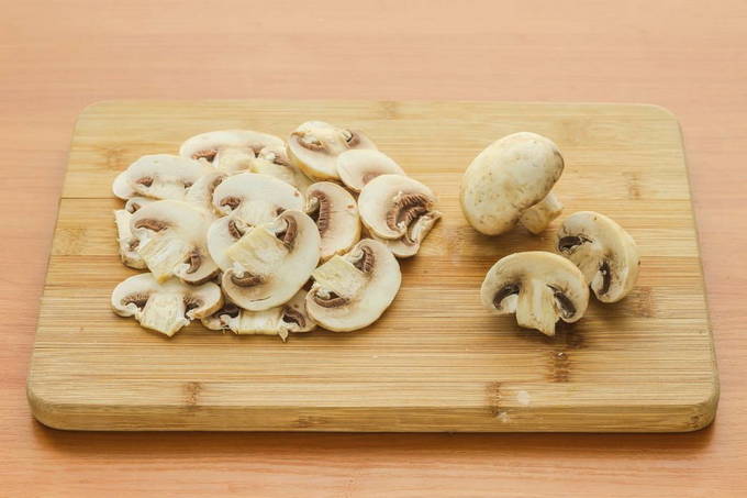 - Snijd kleine champignons in dunne plakjes. Als de champignons groot zijn, is het beter om ze in blokjes te hakken. Bak het bereide product goudbruin.
