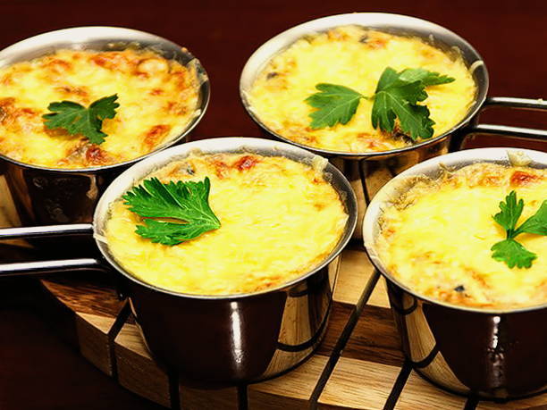 - Heerlijke julienne met kip en champignons met room in potten