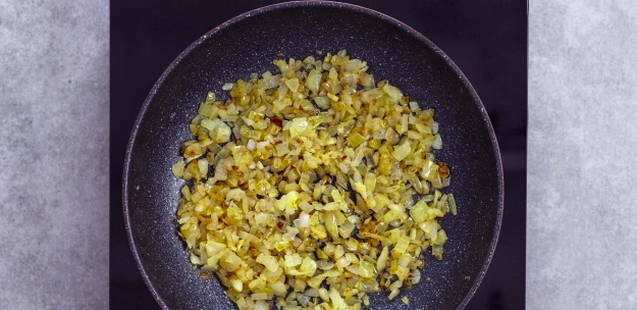 - Schil de uien, hak ze fijn en bak ze goudbruin in plantaardige olie.