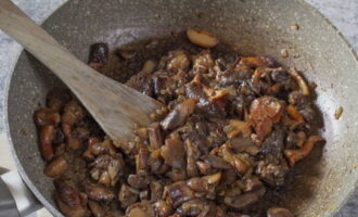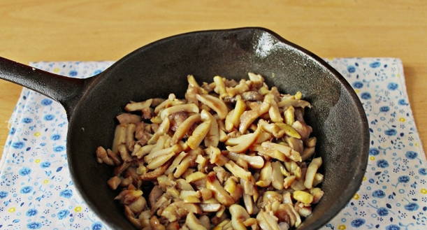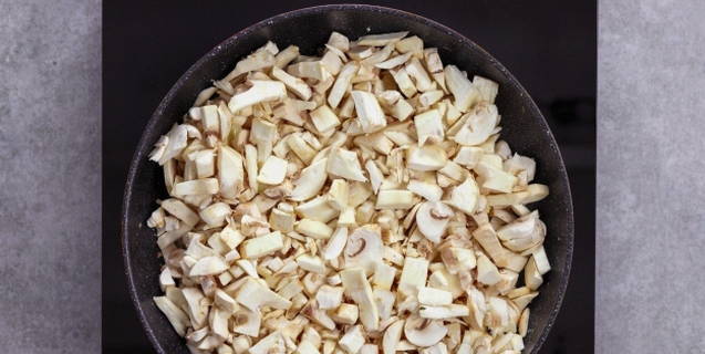 - Was de champignons, snijd ze in blokjes en voeg ze toe aan de pan aan de ui, bak nog eens 10-15 minuten. Al het vocht van de paddenstoelen moet verdampen.
