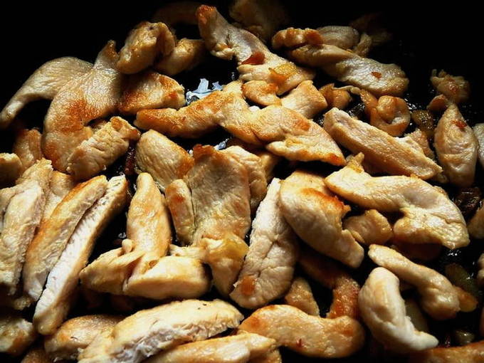 - Spoel de kipfilet, snij in reepjes en bak met knoflook tot ze zacht zijn.
