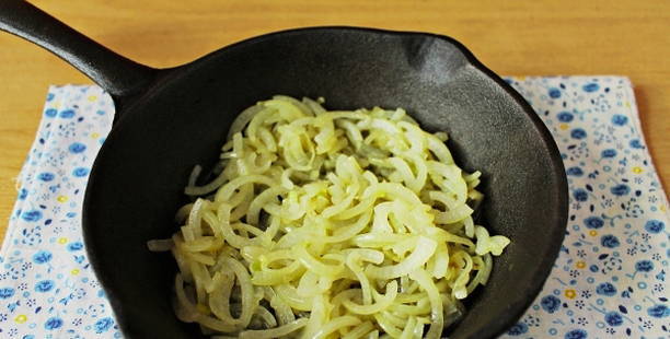 - Snijd de uien in dunne halve ringen. Bak apart van de champignons in een mengsel van groente en boter.