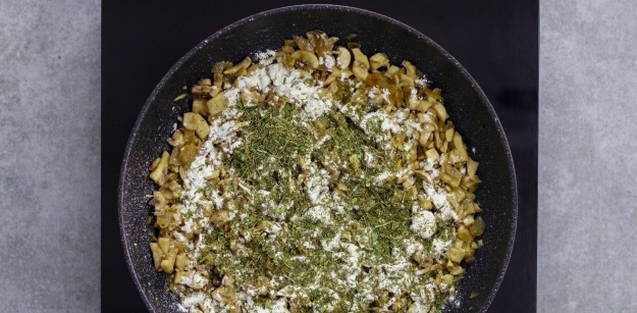 - Voeg vervolgens bloem, Italiaanse kruiden toe en kook nog 1-2 minuten.