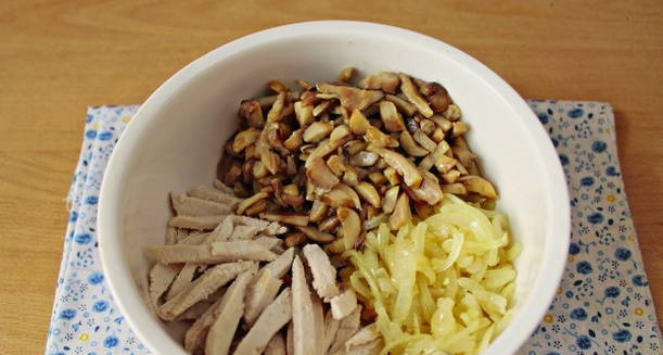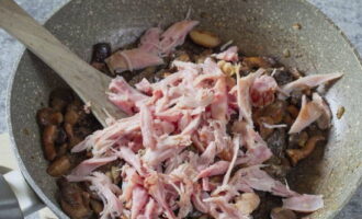 Haal de gebakken ui en champignons van het vuur, voeg de gesneden gerookte kipfilet toe, meng.