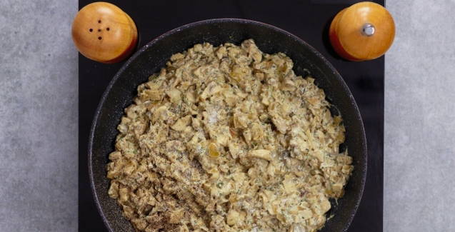 - Combineer kip, champignons en zure roomsaus, voeg kruiden en zout naar smaak toe.