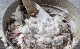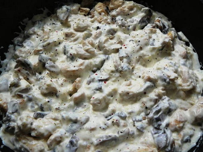 Voeg ook zure room, zout en gemalen peper toe, meng de champignons, uien en kip opnieuw goed.