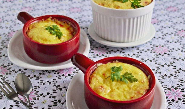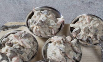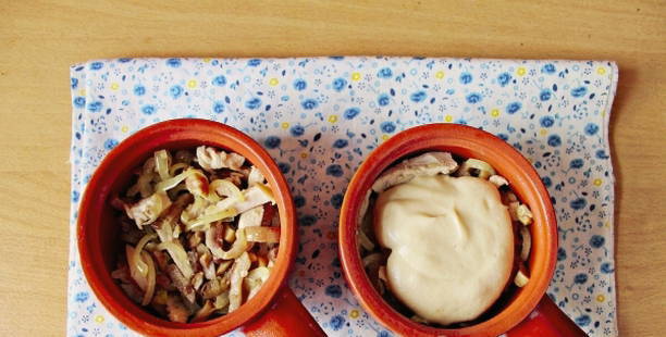 Heerlijke julienne met kip en champignons met zure room in potten