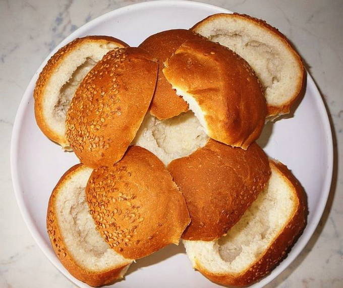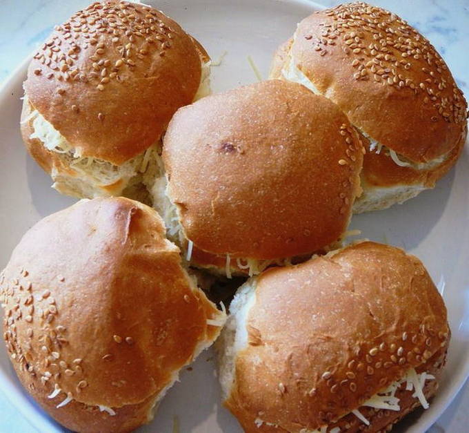 - Snijd de bovenkant van de broodjes af en verwijder voorzichtig het kruim.