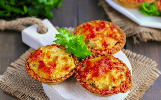 Julienne met champignons, kip en zure room in taartjes in de oven