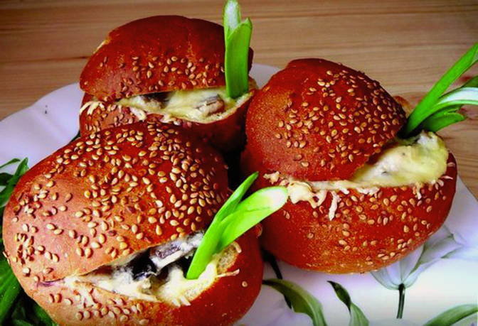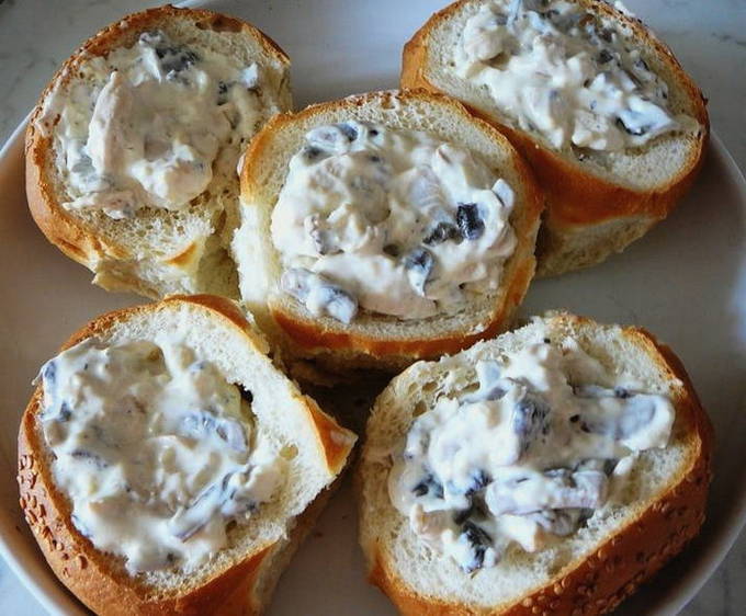 - Vul de broodjes met het champignon-kip mengsel.