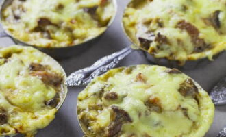Julienne wordt in speciale vormen bereid. Verspreid het werkstuk erin en stuur het naar de oven, voorverwarmd tot 200 graden gedurende 5 minuten.