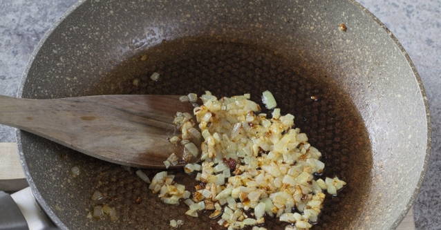 Pel de ui en hak fijn. Bak het vervolgens op middelhoog vuur goudbruin.
