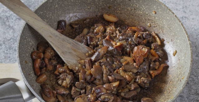 - Snijd de champignons in plakjes en bak ze apart in een pan tot ze goudbruin zijn.