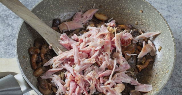 Haal de gebakken ui en champignons van het vuur, voeg de gesneden gerookte kipfilet toe, meng.