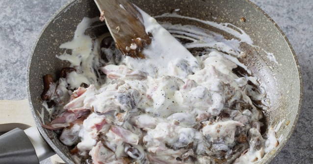 Voeg ook zure room, zout en gemalen peper toe, meng de champignons, uien en kip opnieuw goed.